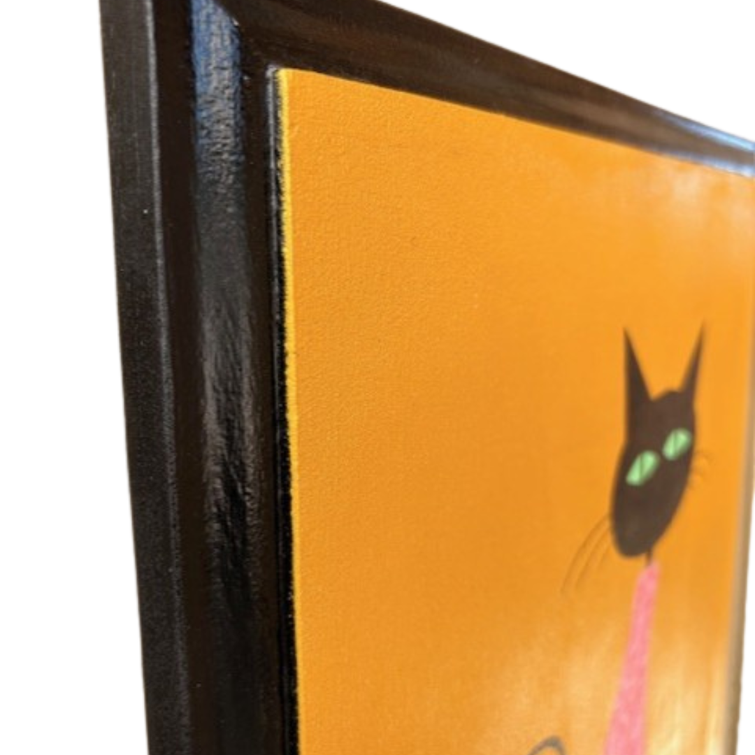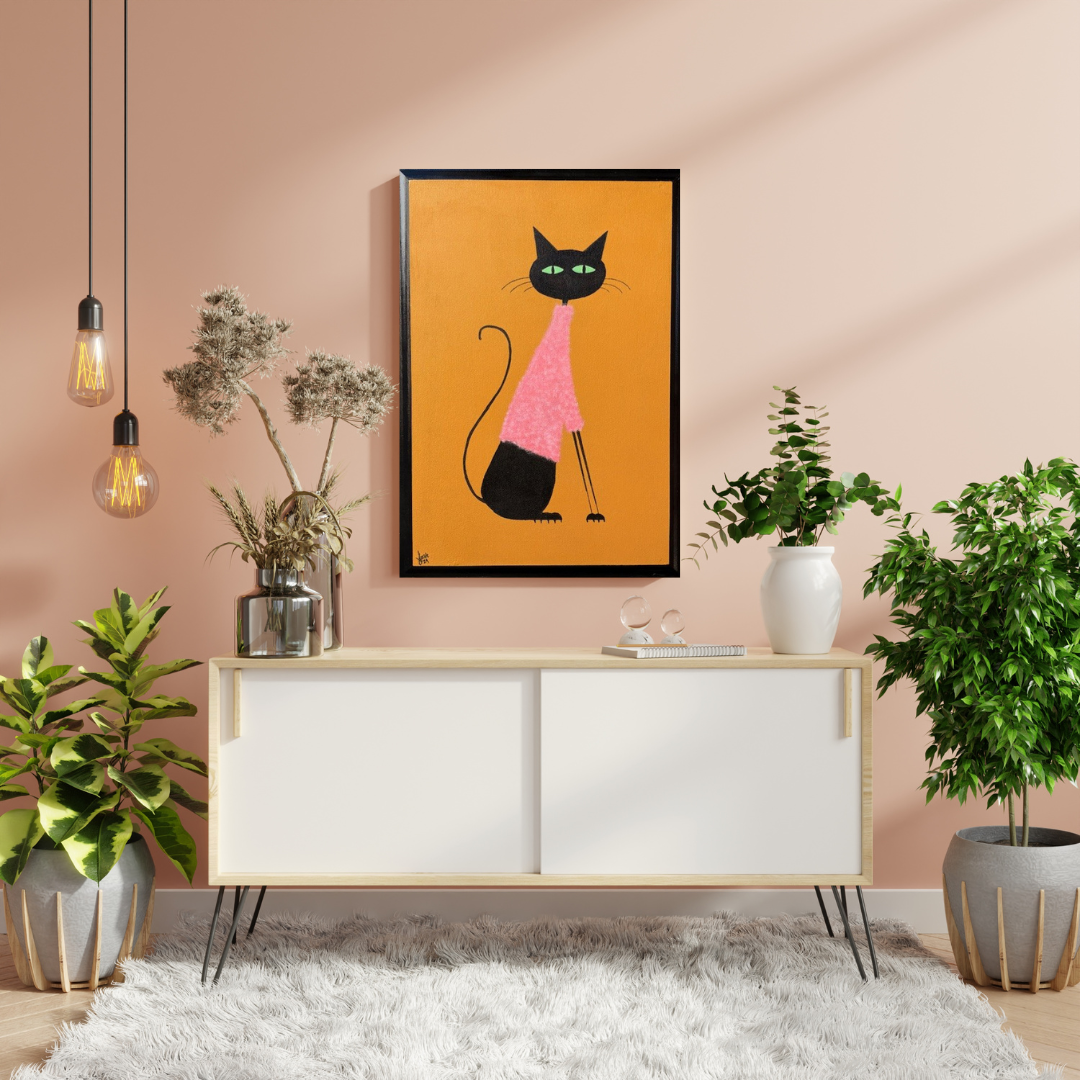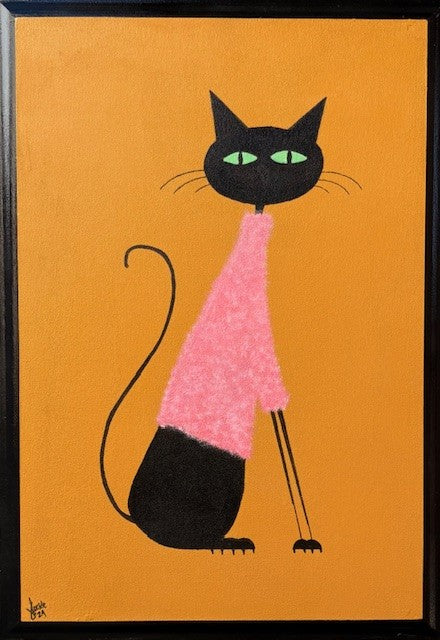 This unique vintage-inspired artwork features a charming black cat dressed in a pink and white sweater, beautifully hand-painted on an upcycled kitchen cupboard door. Blending nostalgic style with sustainable craftsmanship, it adds character and warmth to any space. Perfect for collectors or those seeking a distinctive statement piece with both artistic flair and eco-friendly appeal.