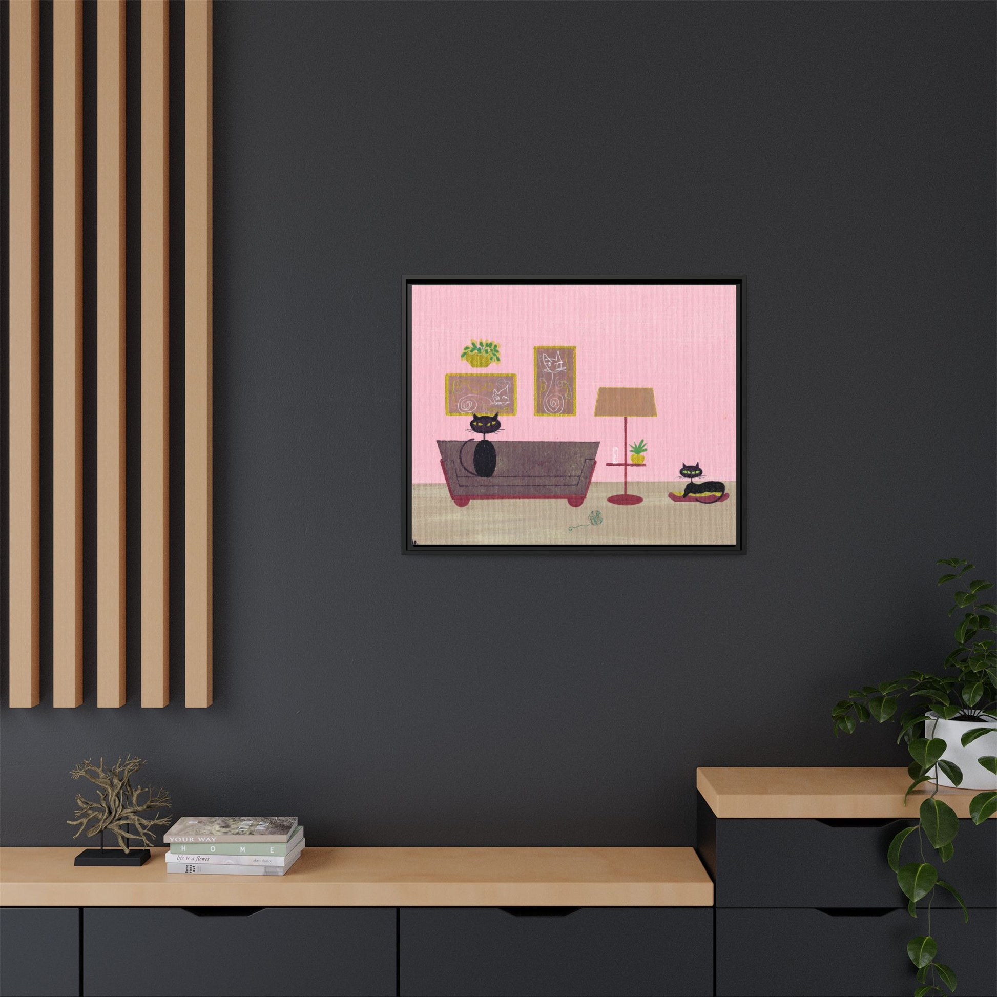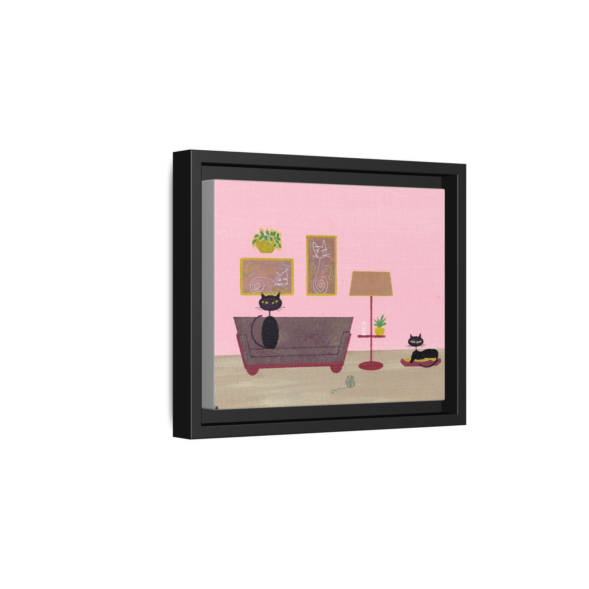 Two sleek black cats lounge in a warm, vintage living room — a quiet moment captured in art. This matte canvas print brings that scene home with velvety blacks, rich mid-century tones, and a soft, non-reflective finish that invites you to step closer. The abstract cat artwork on the wall within the scene adds playful layers, like a conversation between eras: classic silhouettes meeting modern graphic flourishes. Hung above a sofa or on a cozy reading nook wall, this framed canvas creates an intimate, slightly mischievous atmosphere. It suits people who love curated, lived-in interiors: collectors of vintage finds, cat lovers who prefer subtlety over kitsch, and anyone who favors thoughtful, layered décor. The subdued matte surface keeps the focus on texture and detail, while the sturdy pine frame gives a handcrafted, homey presence that blends into evening light. Bring it out for quiet nights, housewarmings, or when you’re arranging a gallery wall with personality rather than trend-driven pieces.