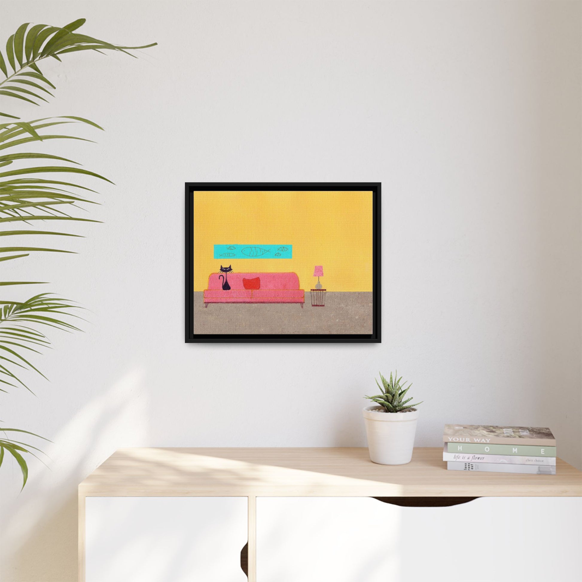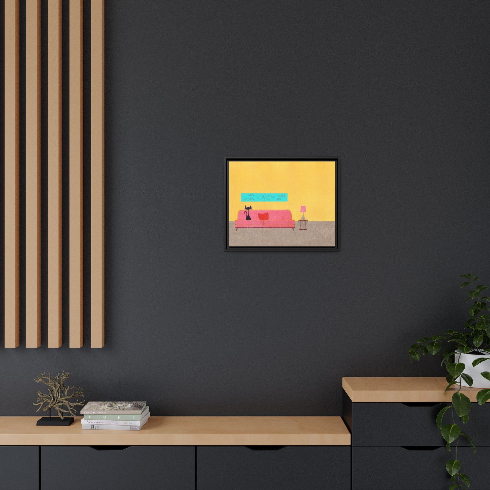 Vintage Mid Century inspired art featuring a black cat on furniture minimalist design, giving off a cozy and retro vibe. Perfect for cat lovers and vintage enthusiasts. Ideal for home decor, especially for those who love unique and quirky pieces. Great for vintage home decor enthusiasts.