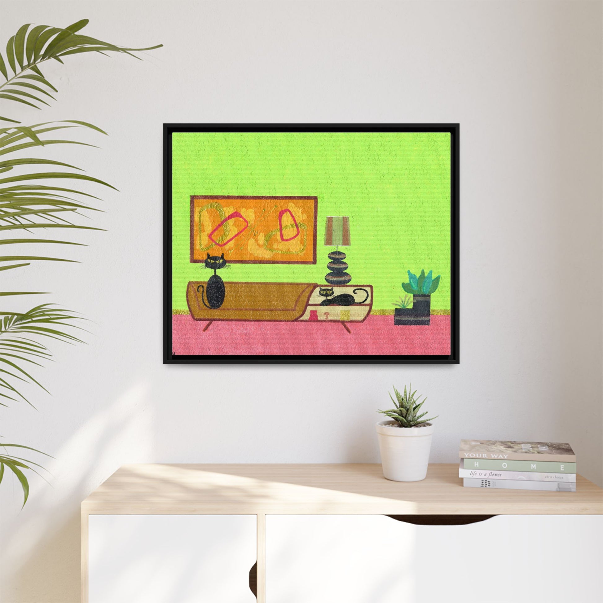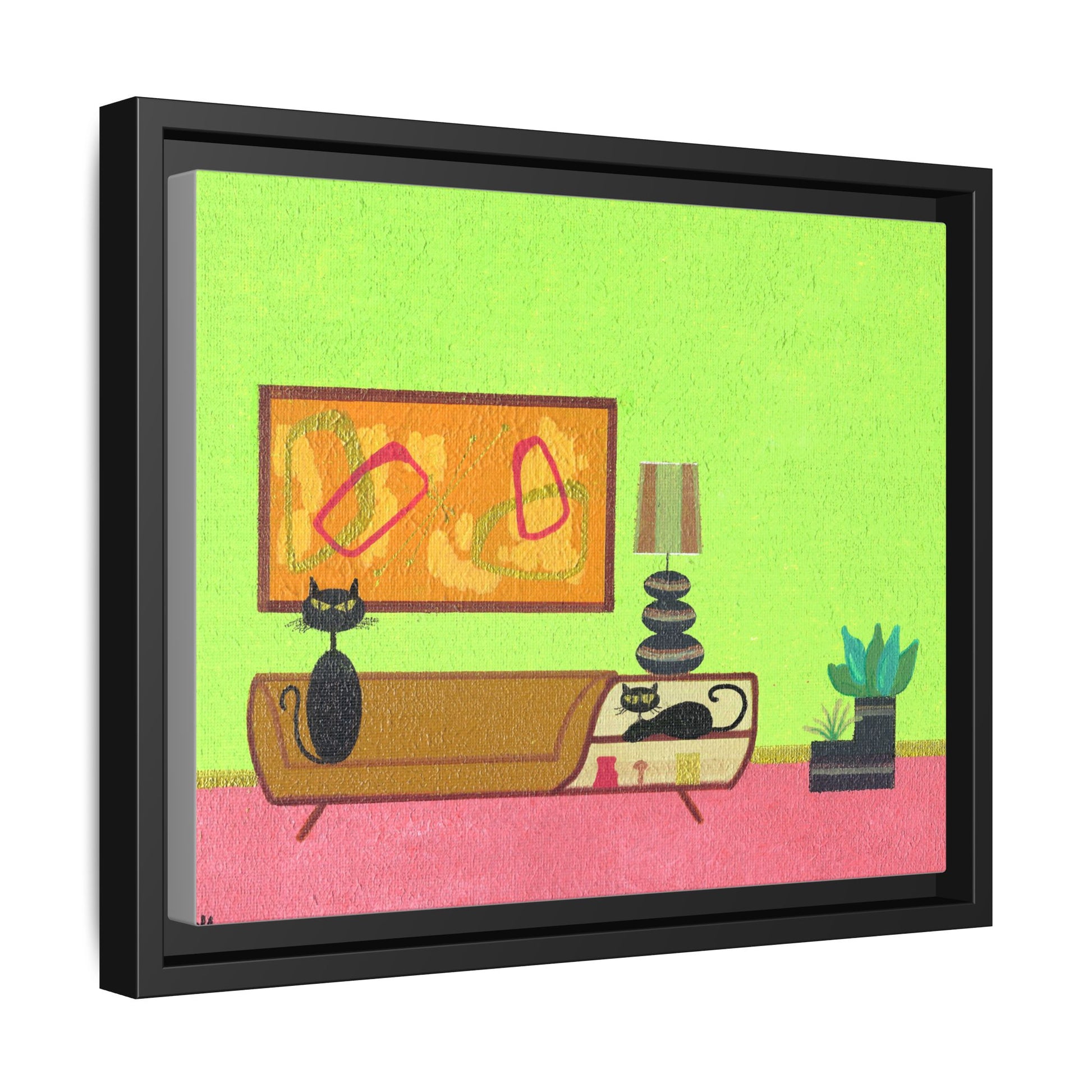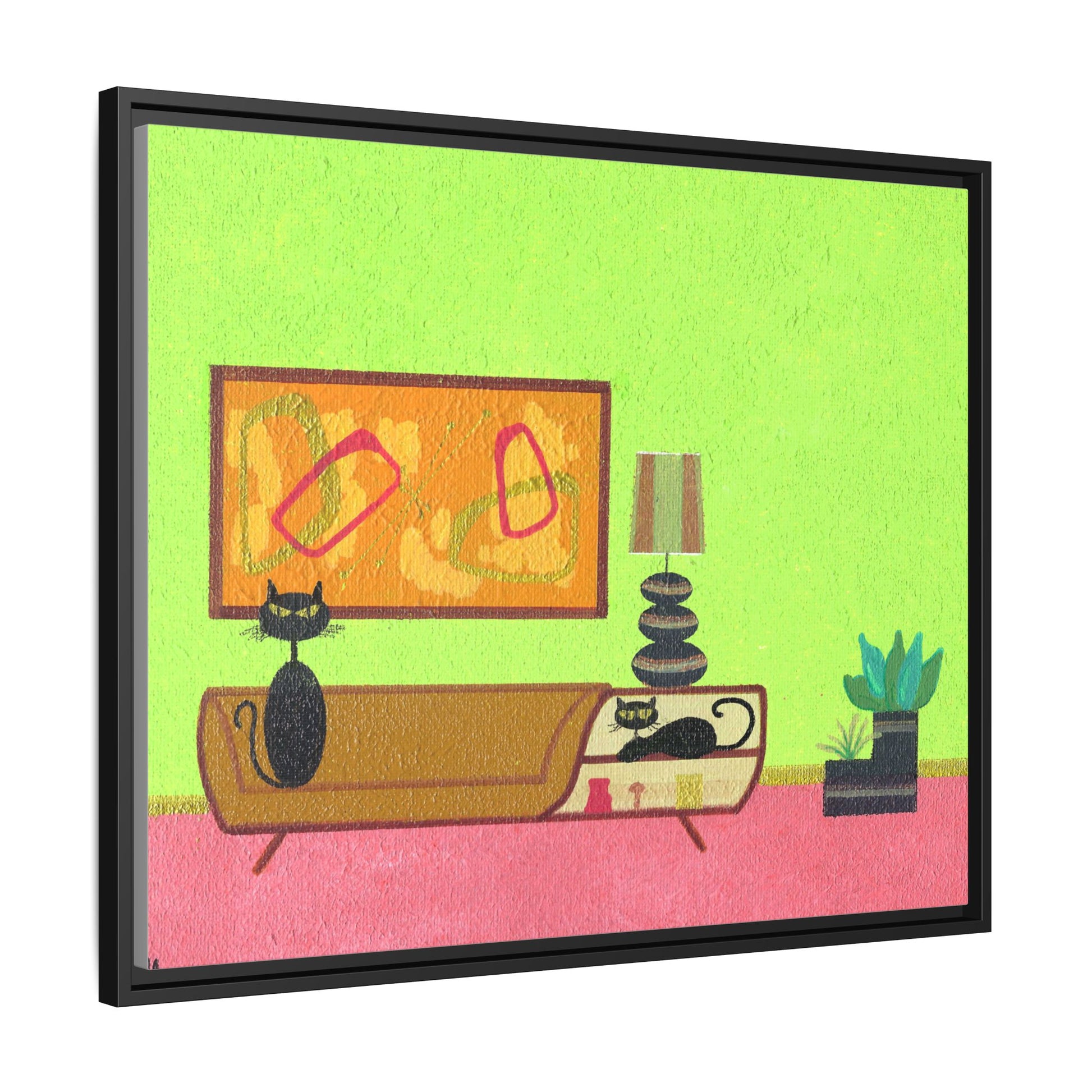 Discover the charm of mid-century whimsy with this delightful, framed canvas print featuring two black cats in a 1950s-inspired scene. One feline lounges contentedly while the other sneaks away to claim their favorite hiding spot—a moment of playful mischief captured in vintage style. Perfect for cat lovers and retro enthusiasts alike, this artwork brings warmth and personality to any room. The classic aesthetic pairs nostalgia with modern appeal, making it an ideal statement piece for bedrooms, living rooms, or creative spaces. Add a touch of vintage elegance and feline charm to your home décor today.