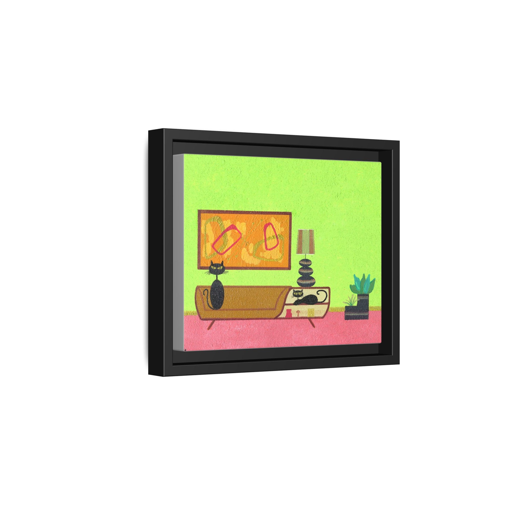 Vintage Mid Century inspired art featuring a black cat on furniture minimalist design, giving off a cozy and retro vibe. Perfect for cat lovers and vintage enthusiasts. Ideal for home decor, especially for those who love unique and quirky pieces. Great for vintage home decor enthusiasts.