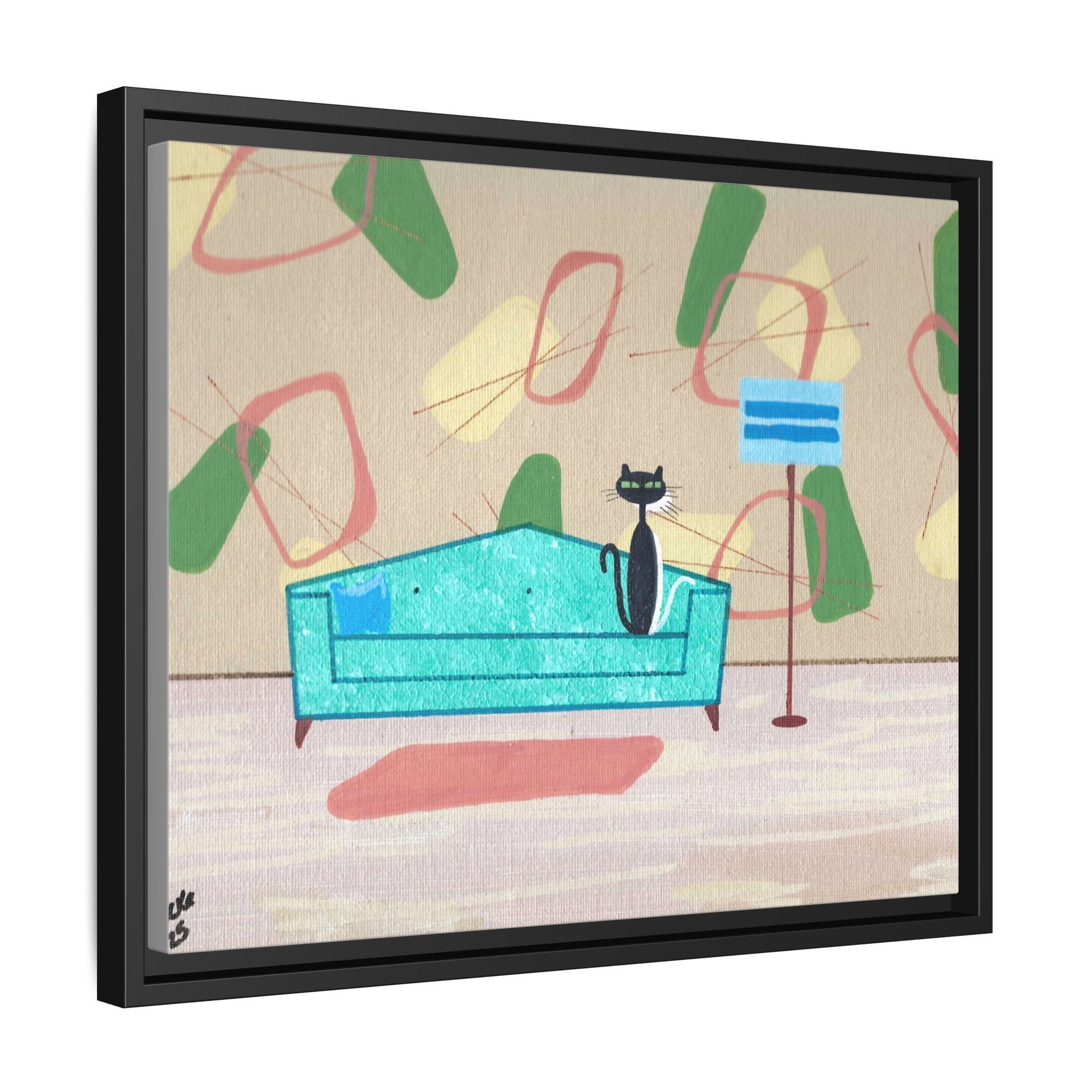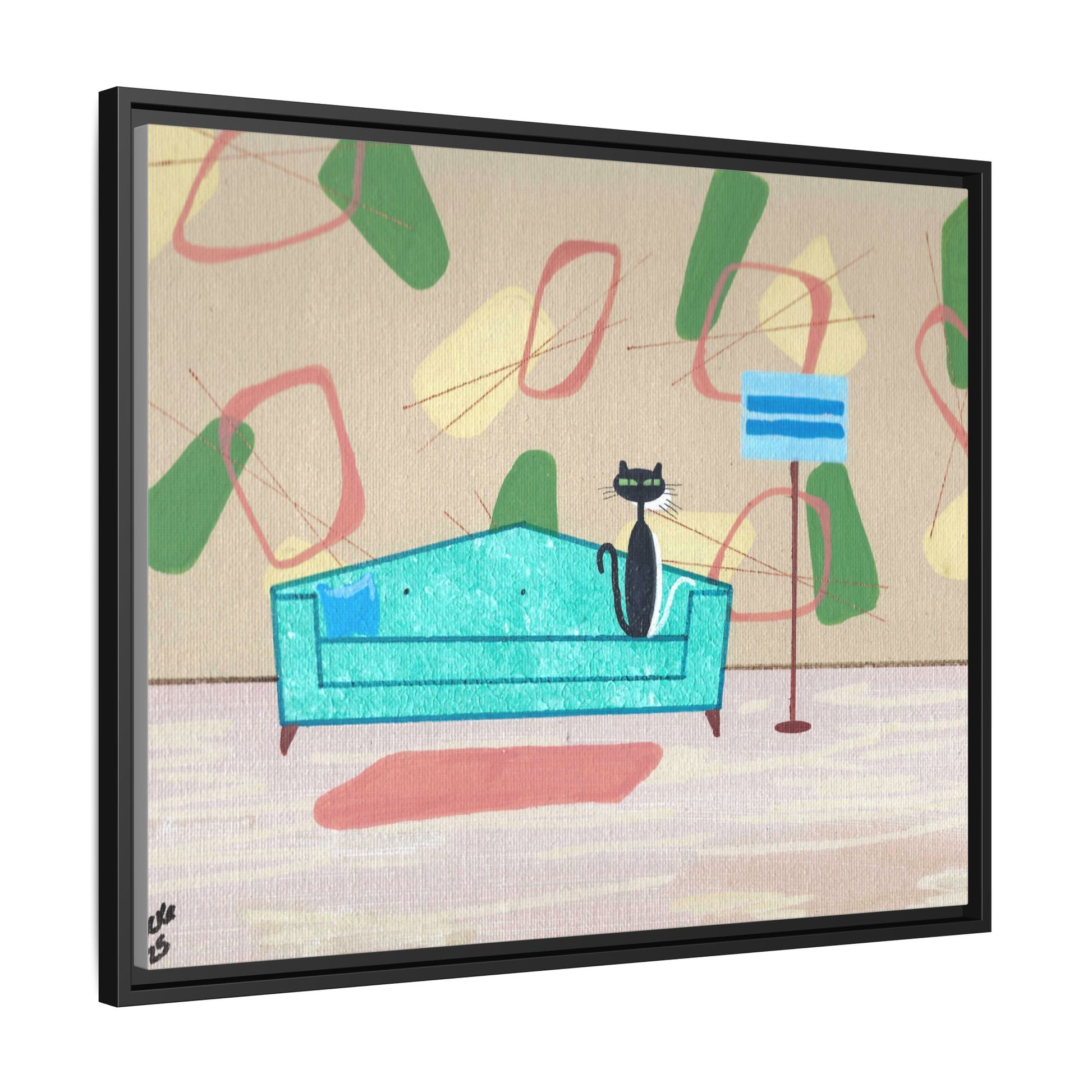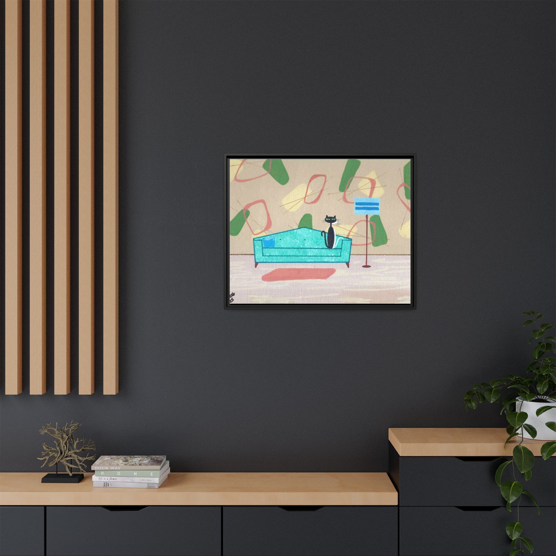 Discover the charm of mid-century whimsy with this delightful framed canvas print featuring two adorable cats—a bold black kitty and a bashful white companion peeking shyly from behind. Set against a vibrant 1950s-inspired wallpaper backdrop, this vintage-styled artwork brings nostalgic warmth and playful personality to any room. Perfect for cat lovers and retro enthusiasts alike, it's a conversation-starting piece that captures the cozy elegance of a bygone era. Transform your space with this enchanting blend of feline charm and timeless design.