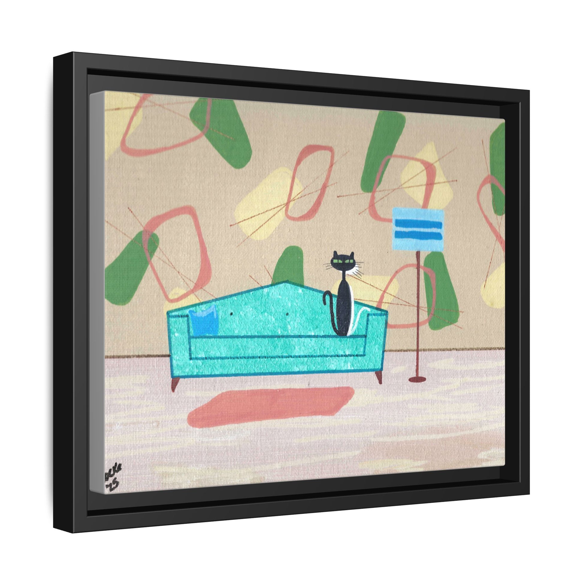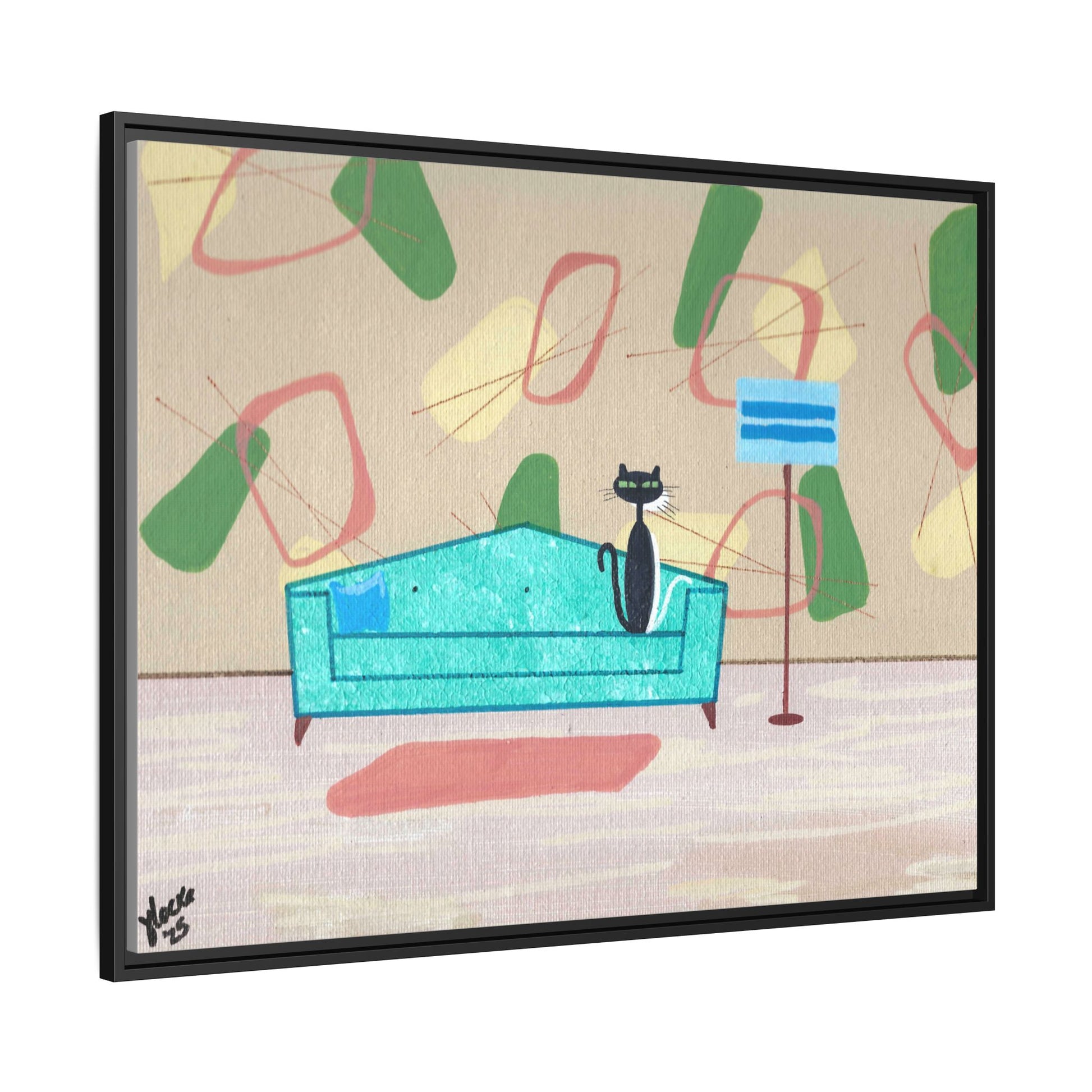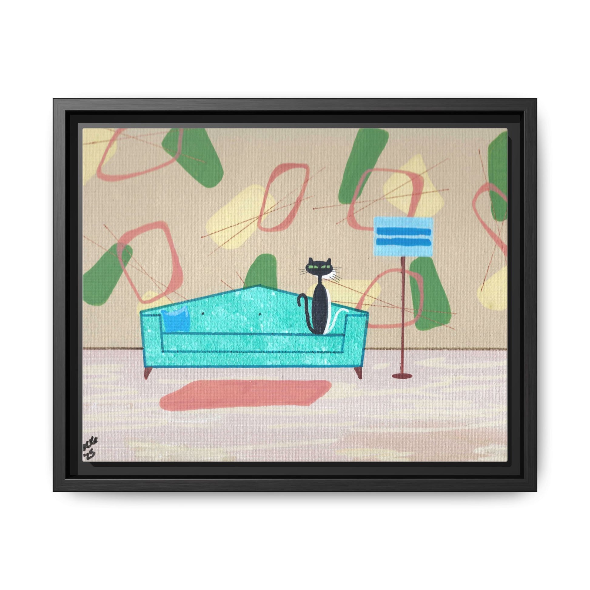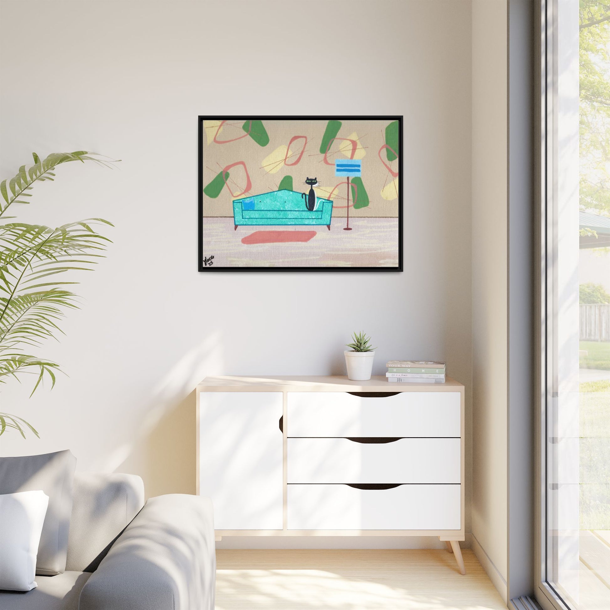 Discover the charm of mid-century whimsy with this delightful framed canvas print featuring two adorable cats—a bold black kitty and a bashful white companion peeking shyly from behind. Set against a vibrant 1950s-inspired wallpaper backdrop, this vintage-styled artwork brings nostalgic warmth and playful personality to any room. Perfect for cat lovers and retro enthusiasts alike, it's a conversation-starting piece that captures the cozy elegance of a bygone era. Transform your space with this enchanting blend of feline charm and timeless design.