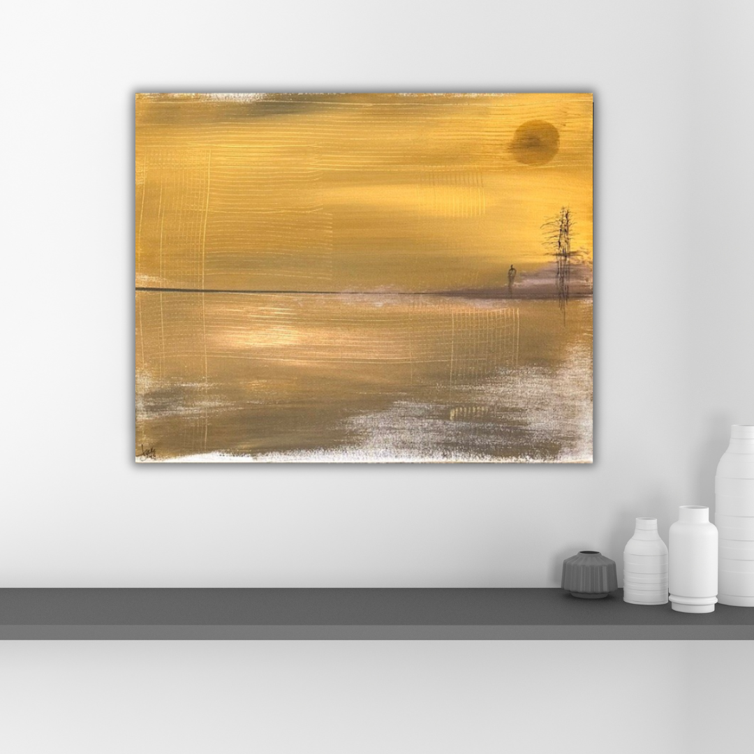 Titled "I Know Where I'm Not," this captivating acrylic and ink abstract captures a solitary tree alongside the silhouette of a person walking, evoking a sense of introspection and journey. A subtle sun peeks over the horizon, hinting at new beginnings and possibilities. Perfect for those who appreciate thoughtful, evocative art that invites reflection and emotional connection.