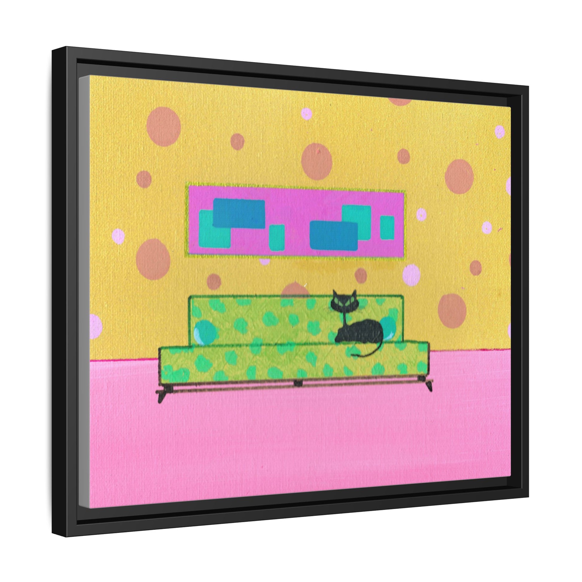 Vintage Mid Century inspired art featuring a black cat on furniture minimalist design, giving off a cozy and retro vibe. Perfect for cat lovers and vintage enthusiasts. Ideal for home decor, especially for those who love unique and quirky pieces. Great for vintage home decor enthusiasts.